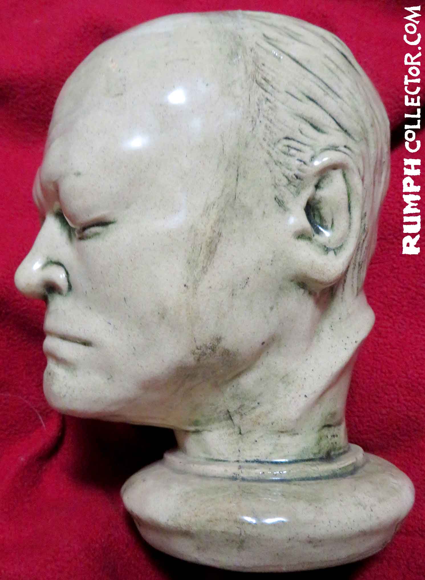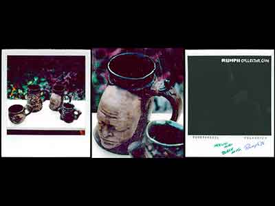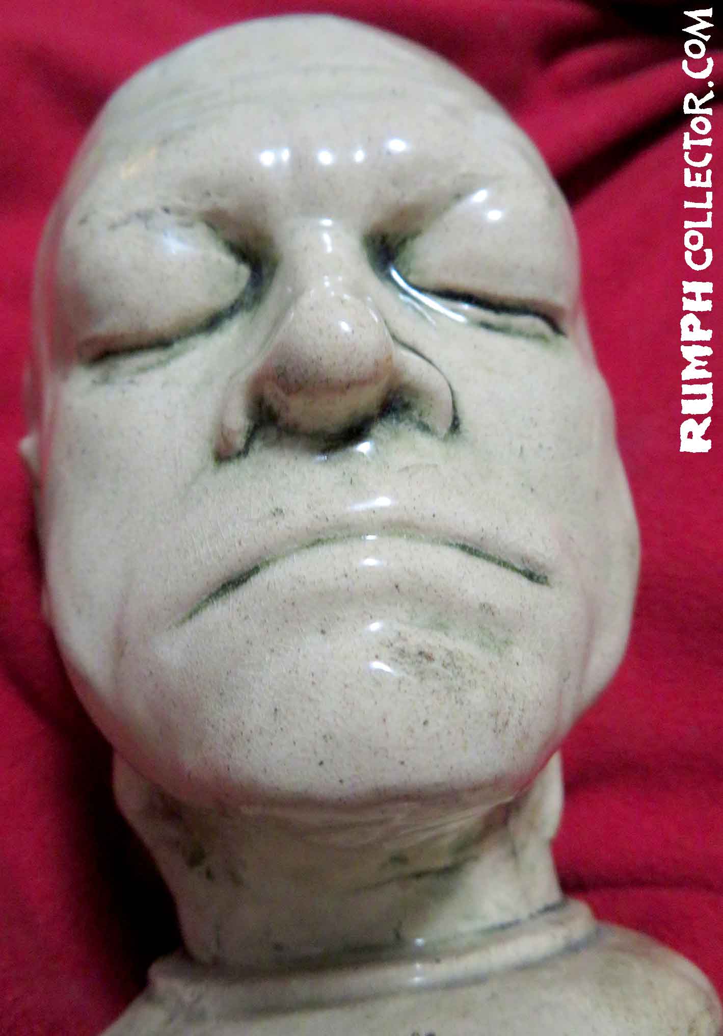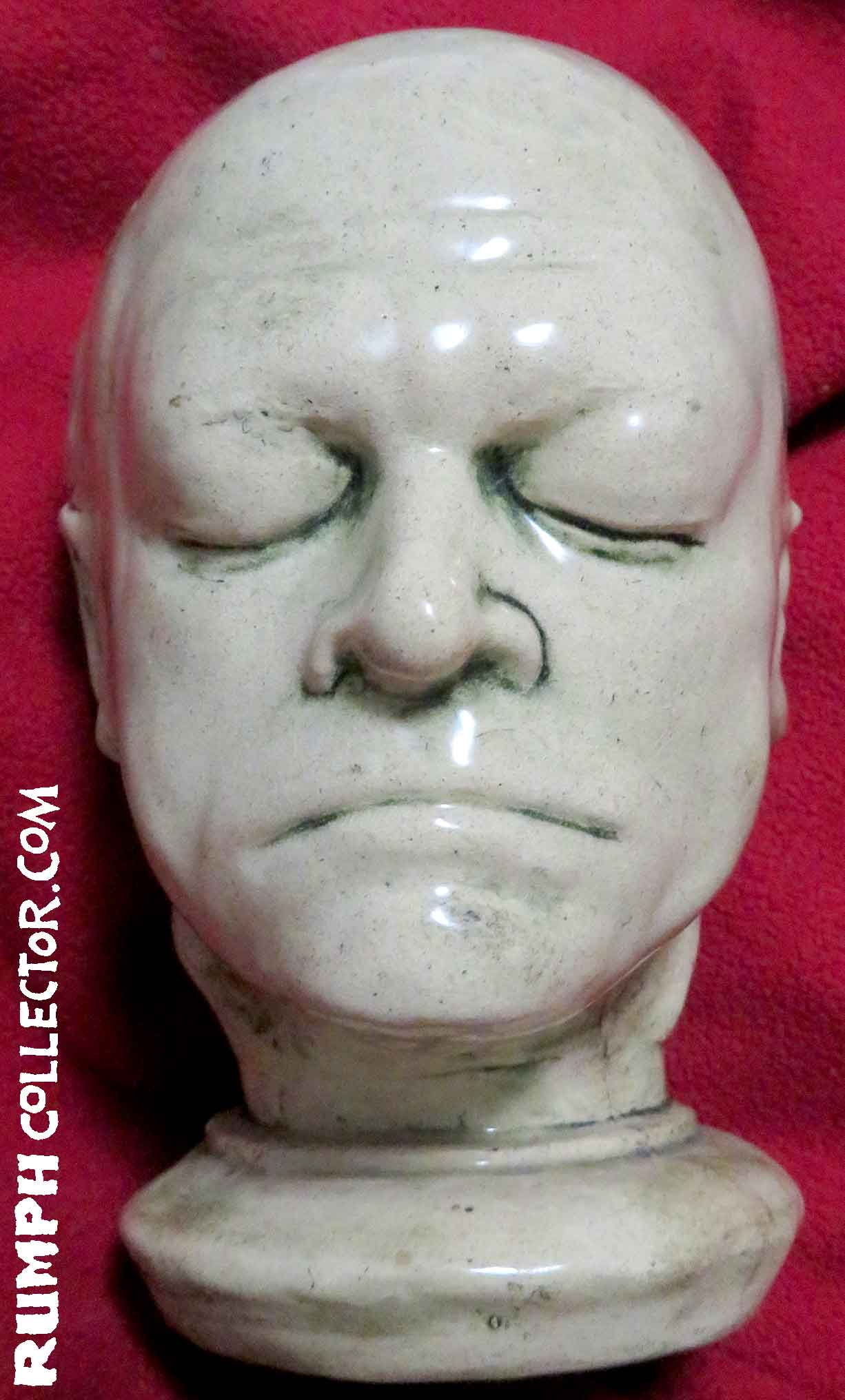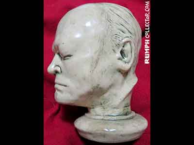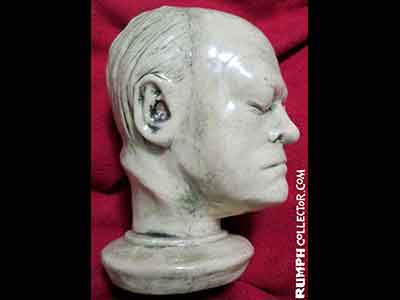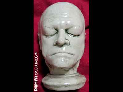 In scanning some photos to eventually be put up on the website, I came across a dark Polaroid with four mugs. I could identify three, but one was of the same face on the bust. The back of the photo was marked "Blake Mug" and signed by Jim, but Blake Who? Then I was scanning a contract with a Rumph border illustration and there were different little faces around the border, one was of William Blake, darn it if the sketch didn't look like the bust. A search of the web showed me a William Blake life mask that was nearly identical to the bust. Case solved. |
