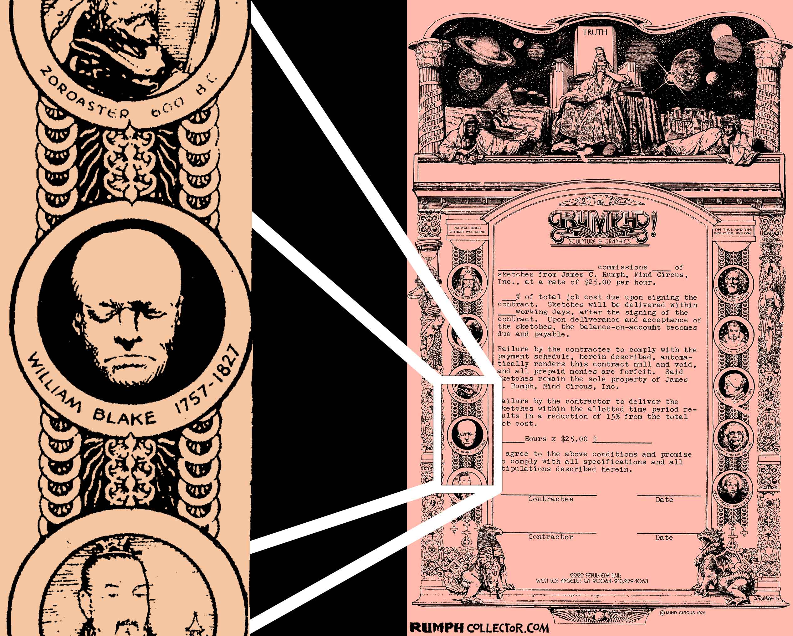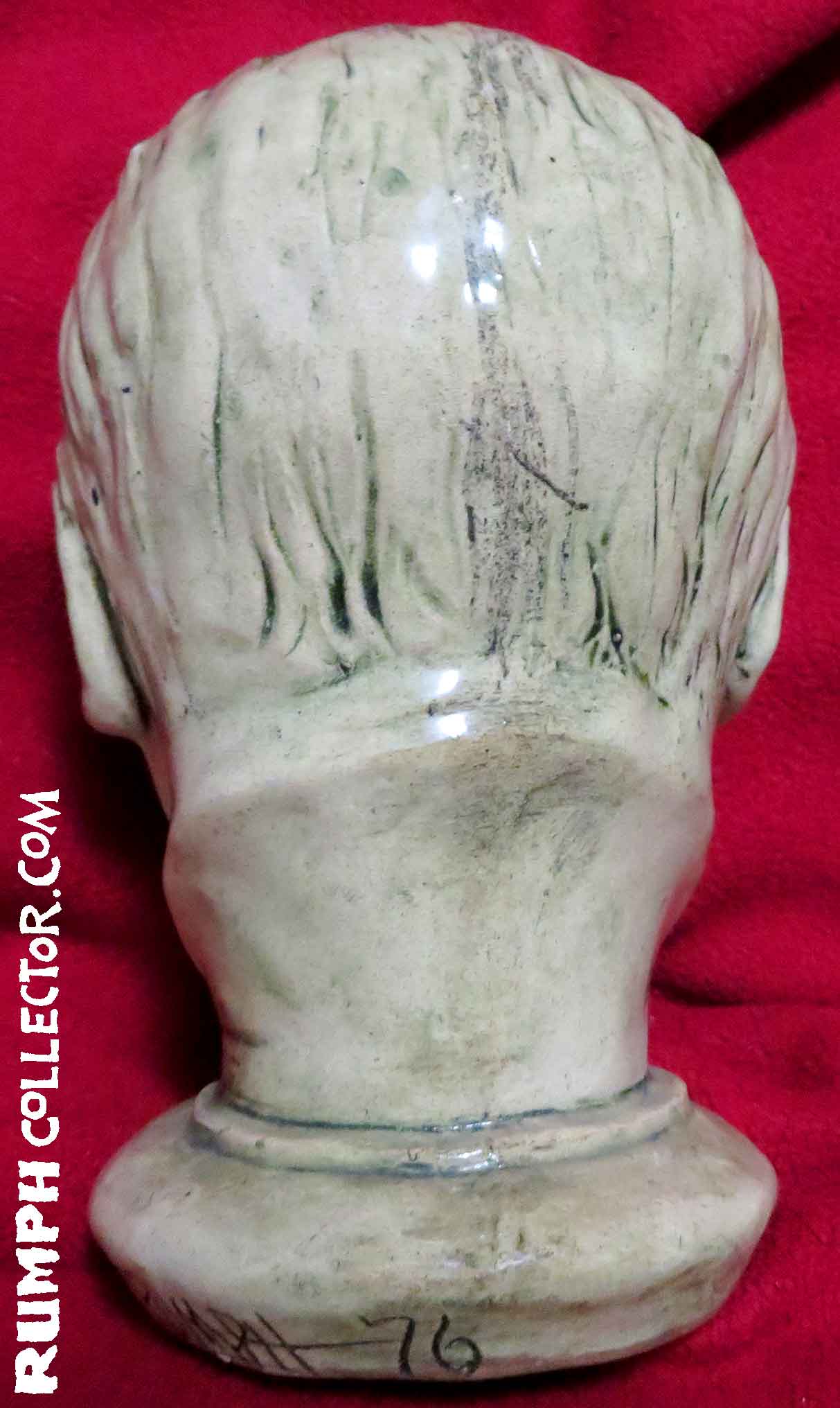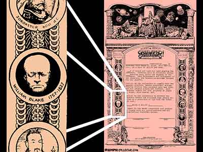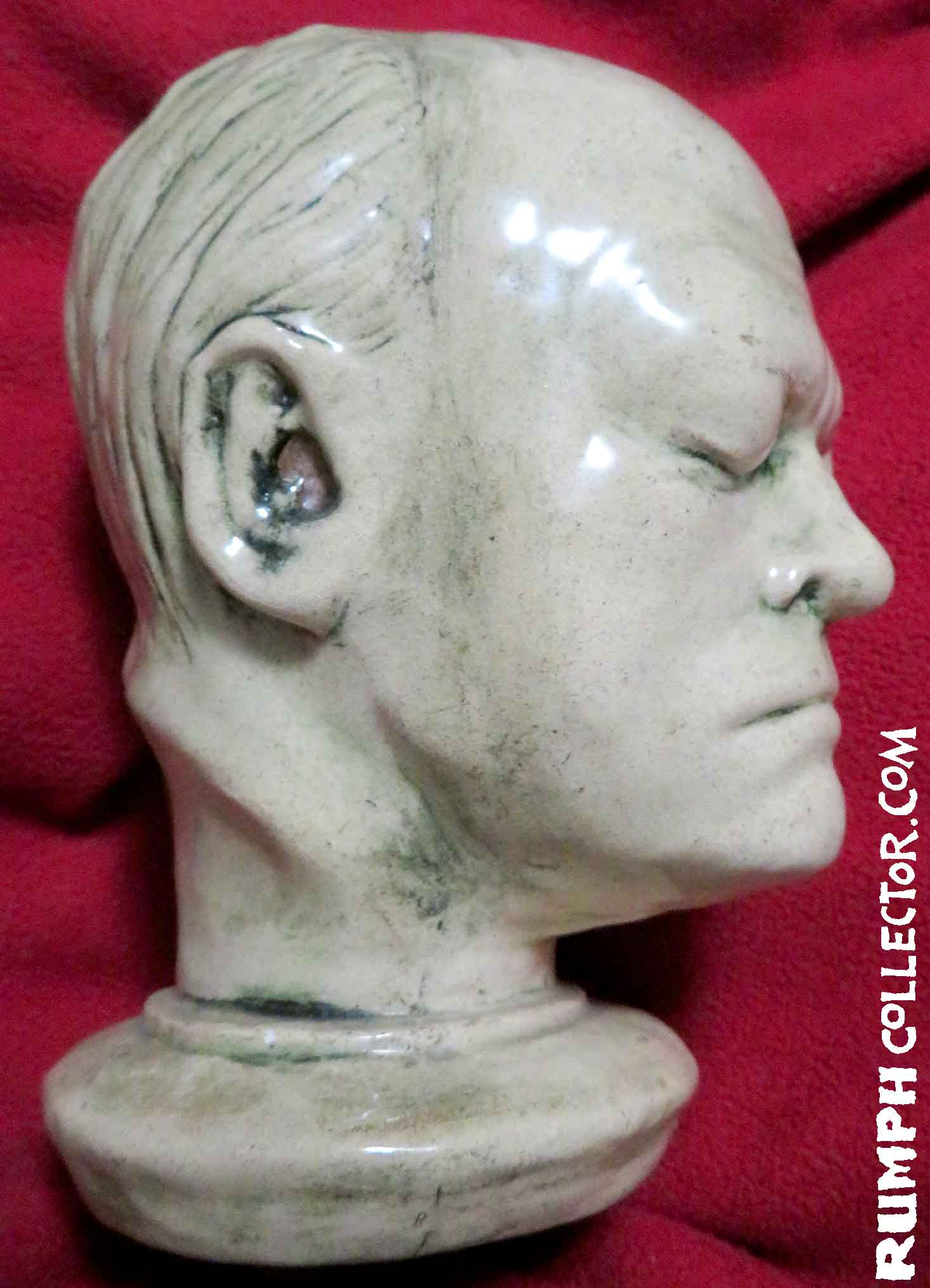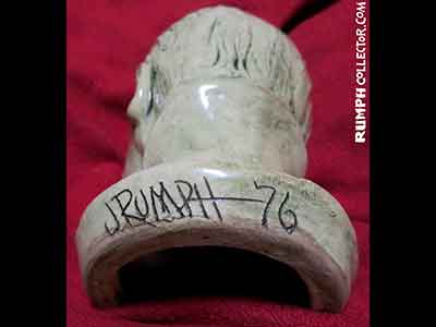 In scanning some photos to eventually be put up on the website, I came across a dark Polaroid with four mugs. I could identify three, but one was of the same face on the bust. The back of the photo was marked "Blake Mug" and signed by Jim, but Blake Who? Then I was scanning a contract with a Rumph border illustration and there were different little faces around the border, one was of William Blake, darn it if the sketch didn't look like the bust. A search of the web showed me a William Blake life mask that was nearly identical to the bust. Case solved. |